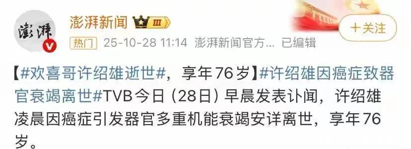 没想到,这一切发生得如此之快!10月28号凌晨,资深演员许绍雄安详离世,享年76岁
